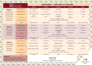 Our school meals are cooked on site by our in house team. We work closely with Wellspring and the kitchen team to provide healthy and delicious meals.